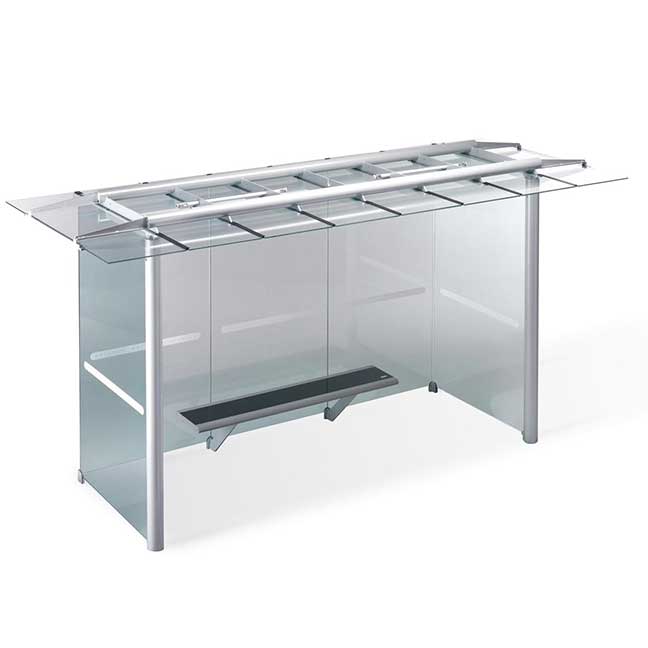 The Atena Shelter is made up of two 120 x 10mm tubular load-bearing columns with 20mm thick 300 x 300 mm base plates. The monolithic roof is formed from two horizontal 100x3 mm tubular ledges upon which seven 12mm thick steel elements are welded, suitably shaped and folded so as to support the 5+5 mm tempered safety glass with suitable gaskets. The shelter is installed onto a reinforced concrete plinth, at finished surface level. The rear and side glass panels are 12mm thick tempered safety glass, fixed to the roof structure and to the lower supports with special clamps. The bench supports are 15mm thick laser shaped steel sheet with 20mm thick, 300 x 300 mm, base plate. All metal parts are galvanised and then polyester powder coated in a corten colour. All fixings are stainless steel. The shelter can be supplied, on request, with lighting.