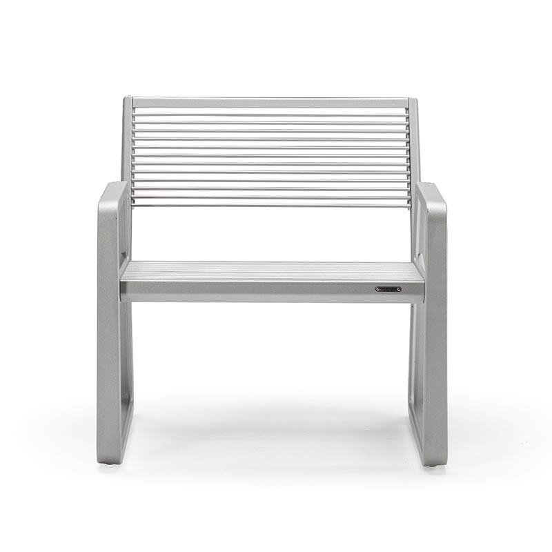 Collection of benches composed of backrest and seat in WPC (Wood Polymer Composite) or hardwood, or steel rods, equipped with an aluminium perimeter profile in aluminium and two supports with armrests in powder coated cast aluminium. The single seat version is also available.