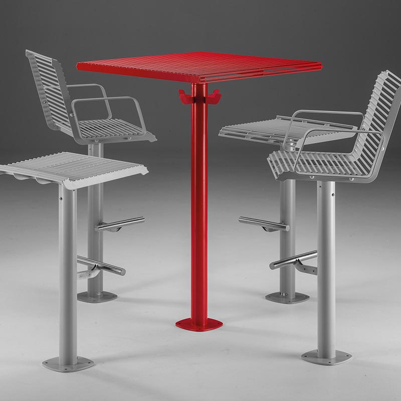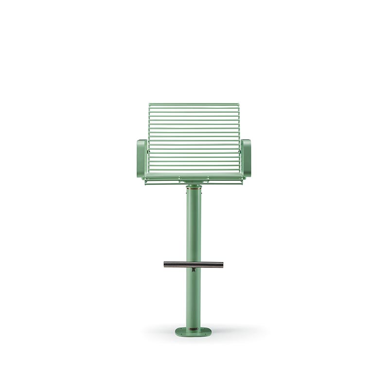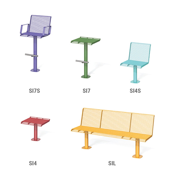 The SI7S, SI7, SI4S, SI4 models are single seats, with different heights, with or without backrest, composed of a vertical support in steel tube and a seat in rods.