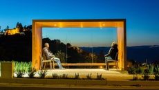 Collection of shelters composed of a bridge-shaped steel structure, covered externally and internally by Corten steel sheets. Available with internal coating in panels in Okumé plywood. The back walls are made of coupled and tempered glass. The shelter can be completed by single-seater seats to create a waiting area and a LED lighting system, integrated in the lower wall of the roof.