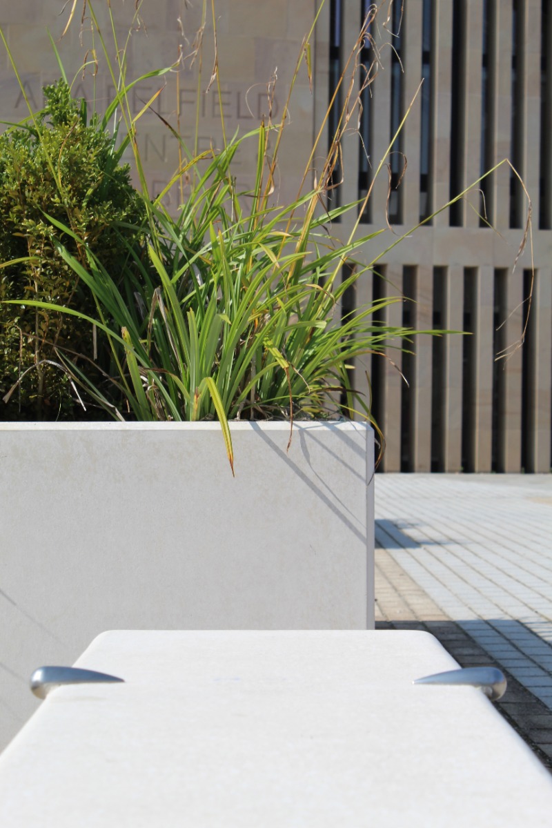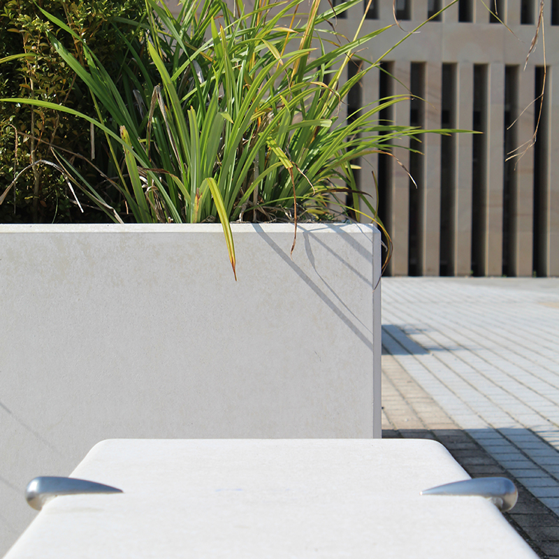 As well as providing space for socialising and natural splashes of colour with plants, the concrete seating and planters echo the light stone of the new section of the development.
