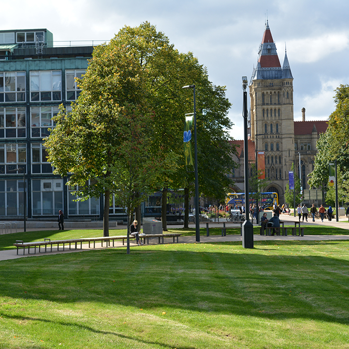 Located off Oxford Road, opposite the Whitworth Hall, Brunswick Park is the largest green space on the University of Manchester campus and includes seating areas, trees, shrubs and wildflower planting plus pedestrian/cycle paths. The parkland was created on the site of the former Brunswick Street to benefit staff, students, visitors and the local community, and is a central part of the University’s Campus Masterplan vision for the future.