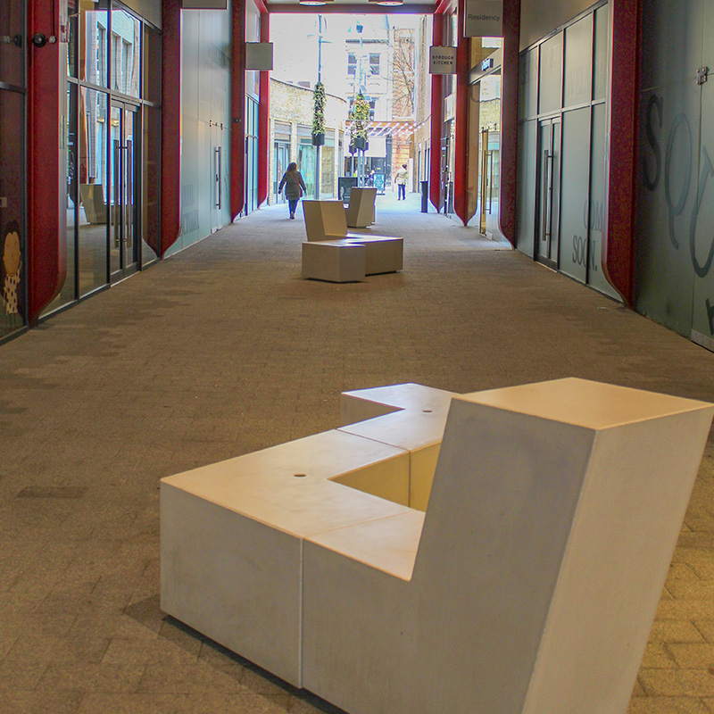 The intention of the project was to bring variety back to the high street and as well as the boutique shops, unique retailers and events spaces this consideration was echoed in the choice of street furniture. A selection of our stone seating and planter elements have been supplied to the site that feature distinctive designs to stand out.