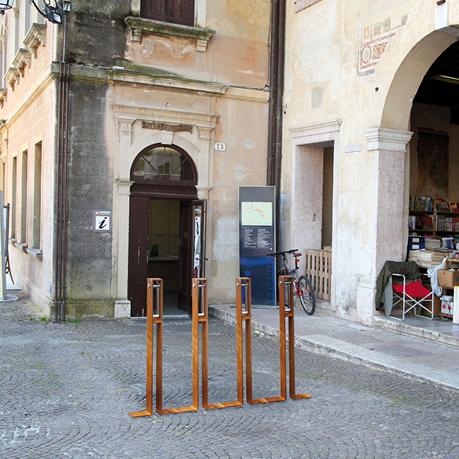 The Guardia Cycle Stand is made from a single piece of shaped corten steel plate with a brushed and electropolished stainless steel movable rod to attach a lock to the bicycle frame. The Guardia can be spaced at 700mm side by side, or spaced at 350mm opposite each other. The corten steel is sandblasted and treated with a unique oxidisation cycle. The antitheft fixings are stainless steel. Also available in Mild Steel Powder coated. Ground fixing is through two anchors installed in the ground, or directly with steel ground anchors (not included).