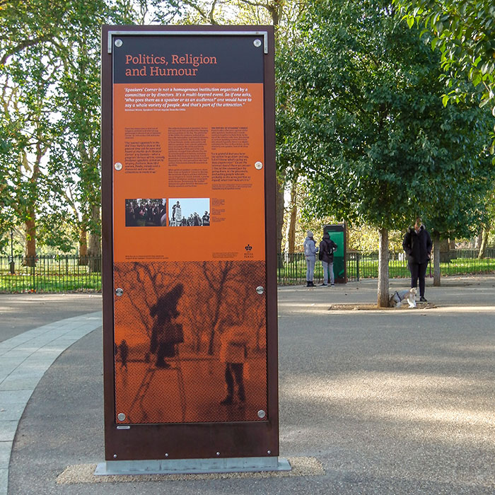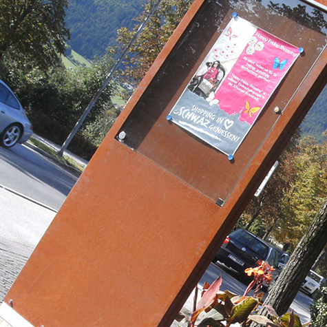The Icaro double sided notice board is made entirely out of thick corten steel sheet, it is then sandblasted and treated with a unique oxidisation cycle. The display surface, measuring 700x1000mm, is protected by two sheets of thick compact polycarbonate, fixed with special plates, alternatively a nonwatertight closing system with two 8mm thick tempered glass wings, with hinges and a locking system. The totem is complete with a front panel in square brushed stainless steel tube, with a solely aesthetic function. Also available to be manufactured in steel sheet, coated with zinc primer and polyester powder. It can be fixed to the ground with a special 6mm thick, brushed stainless steel, base block provided with a plate ready for suitable ground plugs (not included). All fixings are stainless steel.