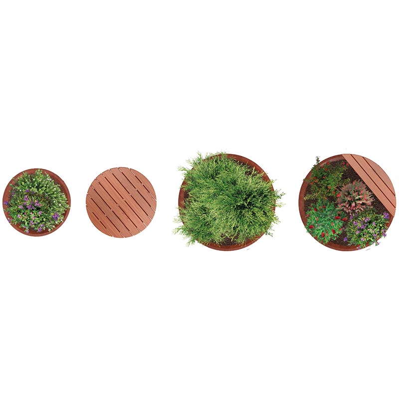 Collection of semi-spherical planters made of steel sheet with central crossed reinforcements as bases. Two sizes are available. The S model can be completely used as a seat thanks to the proper accessory (SW) in wood or in WPC (Wood Polymer Composite).